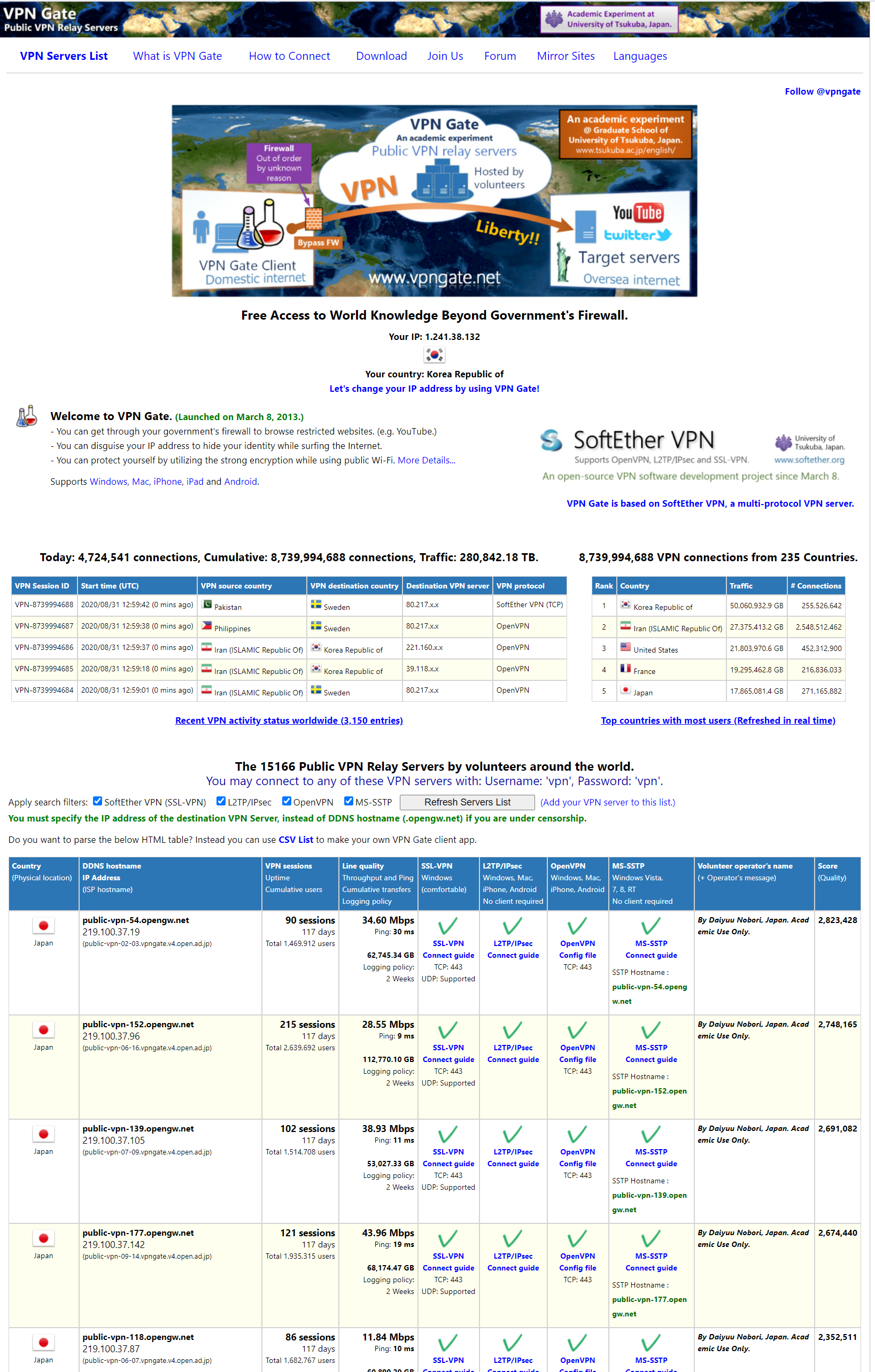 Follow @vpngate Free Access to World Knowledge Beyond Government's Firewall. Your IP: 121.53.241.14Your country: Korea Republic ofLet's change your IP address by using VPN Gate! Today: 4,751,906 connections, Cumulative: 8,740,924,091 connections, Traffic: